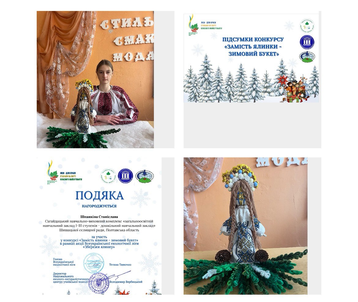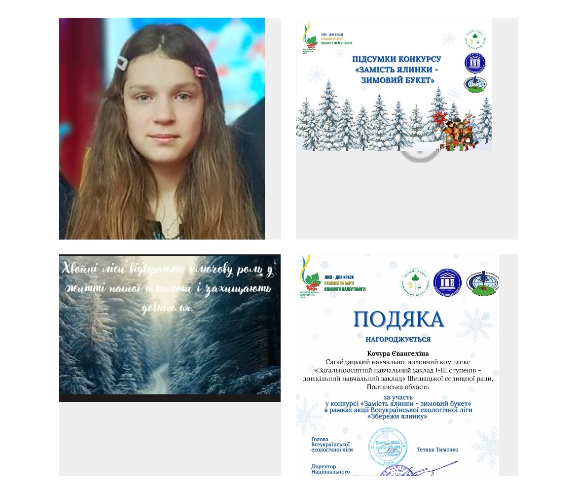 У конкурсі «Замість ялинки – зимовий букет» в рамках акції Всеукраїнської екологічної ліги «Збережи ялинку» Шпанкіна Станіслава та Кочура Євангеліна нагороджені Подяками за участь.